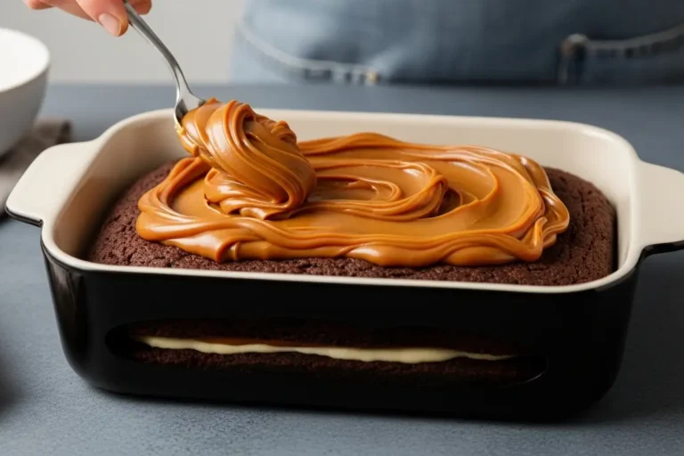 - O roteiro mostra a técnica perfeita para um pão de mel já recheado: coloque metade da massa na forma, espalhe as colheradas de doce de leite sem açúcar por cima, e depois cubra com o restante da massa. Assim, o recheio fica concentrado no meio, criando uma camada cremosa deliciosa.