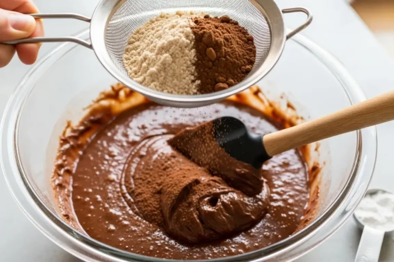 Peneire sobre a mistura líquida a farinha de aveia e o chocolate em pó 100%. Misture muito bem com uma espátula, até a massa ficar uniforme e sem gruminhos. A massa ficará mais densa. Por último, acrescente o fermento em pó e misture levemente.