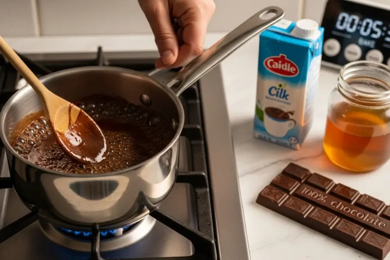 - A caldinha que a gente faz para molhar o bolo é super simples e saudável! Usamos leite, chocolate 100% cacau (que é puro cacau, sem açúcar) e um pouquinho de mel só para equilibrar. É ela que vai garantir que o bolo fique ainda mais molhadinho e com um sabor intenso de chocolate.