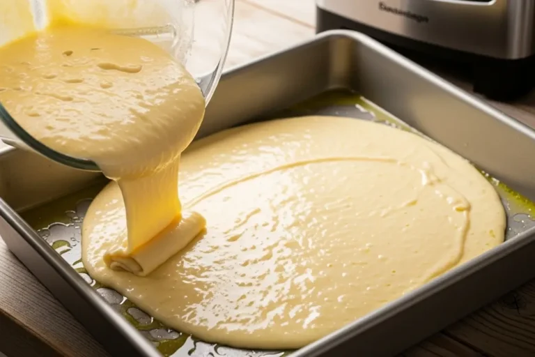 Unte bem uma forma ou travessa retangular (tamanho aproximado 20×30 cm). Despeje metade da massa do liquidificador na forma e espalhe para cobrir todo o fundo.