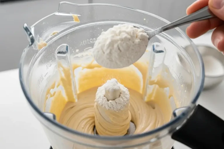 Com o liquidificador ainda ligado em velocidade baixa, ou ligando e desligando no modo pulsar, vá adicionando a farinha de trigo aos poucos, umas 10 colheres de sopa no total. Bata bem entre cada adição, até a farinha se incorporar por completo e a massa ficar lisa e cremosa, parecida com uma massa de bolo mais grossinha.
